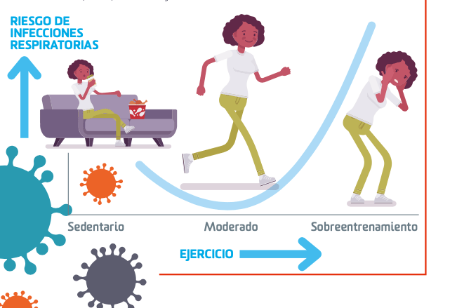 Si sobrepasamos este tiempo en un margen de 15-20 minutos más por día, las defensas se mantendrán al mismo nivel, pero que si lo sobrepasamos aún más, empezarán a disminuir, llegando incluso a valores inferiores a si no hiciéramos ejercicio, lo que suele ocurrir a partir de las 8 horas de entrenamiento semanal.