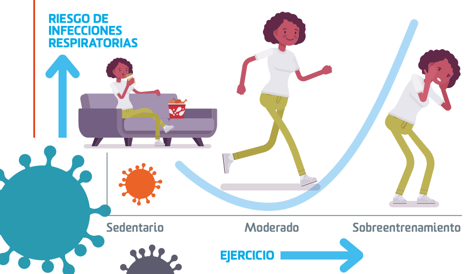 Si sobrepasamos este tiempo en un margen de 15-20 minutos más por día, las defensas se mantendrán al mismo nivel, pero que si lo sobrepasamos aún más, empezarán a disminuir, llegando incluso a valores inferiores a si no hiciéramos ejercicio, lo que suele ocurrir a partir de las 8 horas de entrenamiento semanal.