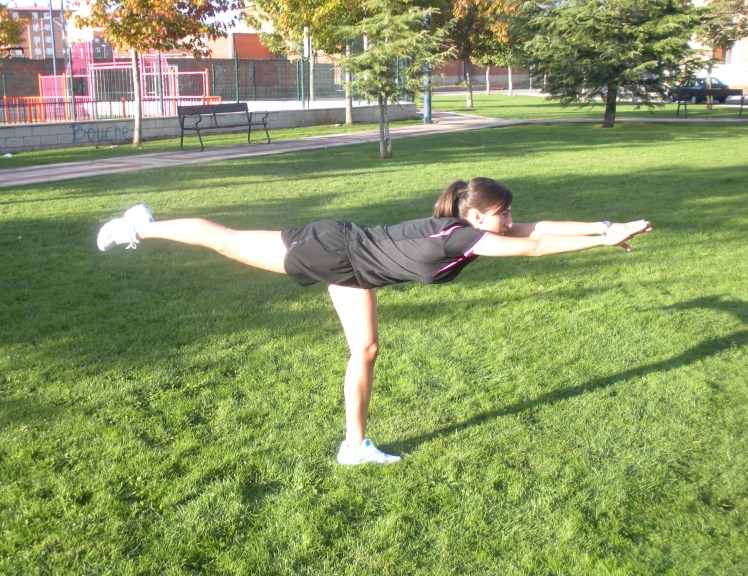 - Estirar el cuádriceps en equilibrio sobre un pie.