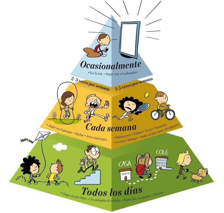 En la foto, os muestro una pirámide de la actividad física del Gobierno de Navarra orientada a los niños que me parece muy acertada, dado que prioriza como actividad física principal aquella que se hace a diario con las sencillas acciones cotidianas, dándole más importancia que a la propia actividad deportiva.