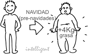 La ganancia de grasa es lenta y paulatina, al igual que sucede en su pérdida, por tanto sé “intelligent-e” y piensa que lo que comemos del día de Navidad hasta el día de Reyes no engorda tanto, y que lo importante es que nos cuidemos desde Reyes hasta las siguientes Navidades, sobre todo en esas semanas previas en las que nos dejamos llevar sin darnos cuenta como ya os he comentado.