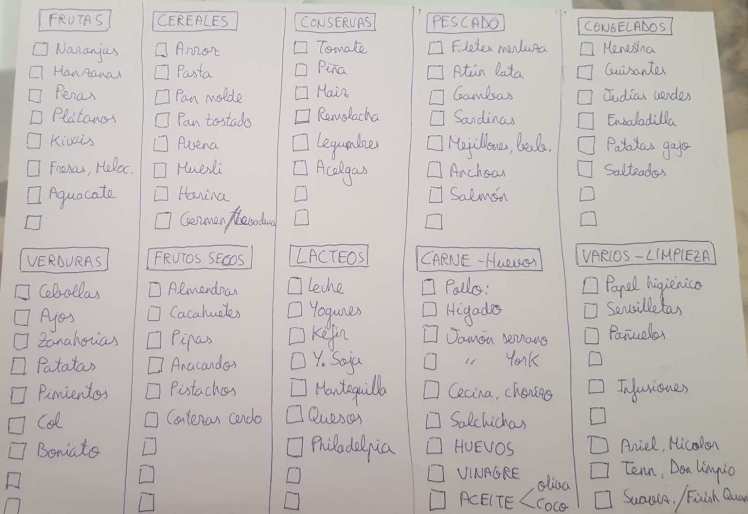 AQUÍ TIENES UNA LISTA SENCILLA PARA CUANDO VAYAS A COMPRAR Y QUE ASÍ NO TENGAS QUE PENSAR MUCHO EN EL SUPERMERCADO, AHORRES DINERO Y PUEDAS HACER DESPUÉS LAS DIFERENTES COMIDAS SALUDABLES QUE TE INDICARÉ: